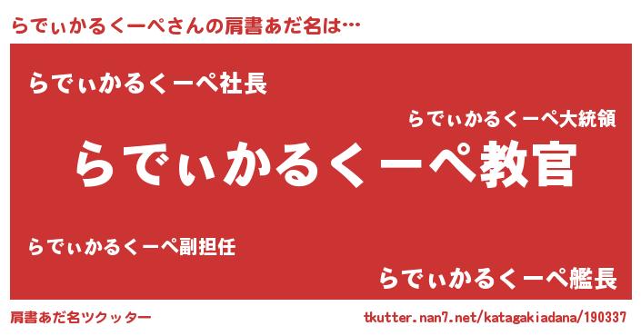 | 意味不明あだ名 | 『住所不定無職らでぃかるくーぺ(4歳)』 |