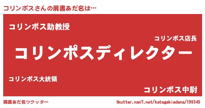 | 男性向けラノベタイトル風あだ名 | 『コリンポスに滅ぼされるだけの簡単なお仕事です』 |