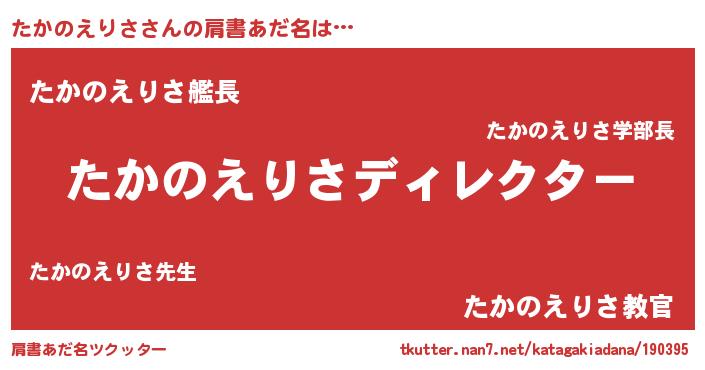 | ヒーロー風カッコイイあだ名 | 『仮面タカダー』『ネオタカノエリサ』 |