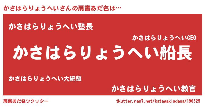 | 胡散臭い通販商品みたいなあだ名 | 『信頼と実績のサプリメント…その名も「かさはらりょうへい」』 |