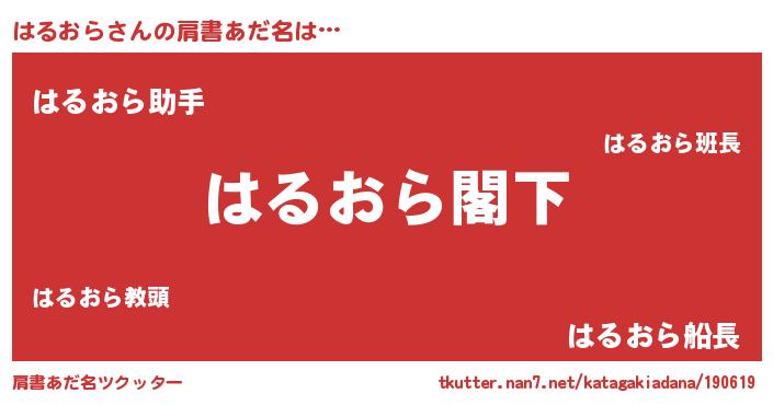 | 男性向けラノベタイトル風あだ名 | 『Re:はるおらから始める異世界生活』 |
