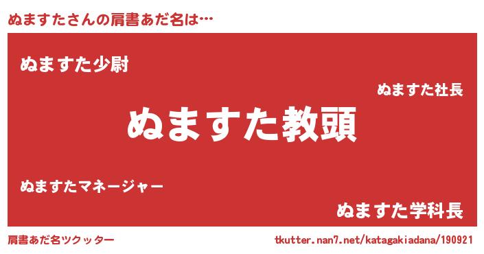 | 男性向けラノベタイトル風あだ名 | 『ぬますたという概念が存在しない退屈な世界 』 |