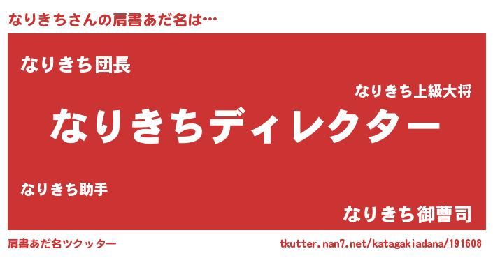| 男性向けラノベタイトル風あだ名 | 『なりきちに滅ぼされるだけの簡単なお仕事です』 |