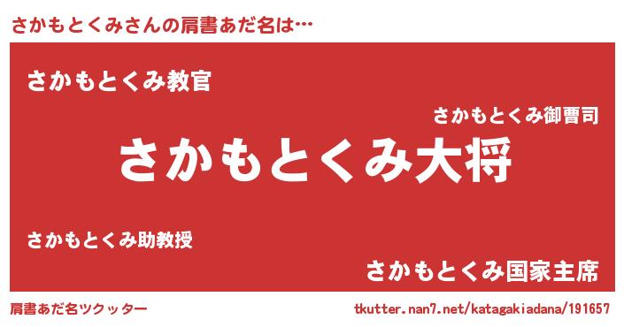 | 男性向けラノベタイトル風あだ名 | 『さかもとくみ~年齢イコール彼女いない歴の魔法使い~』 |