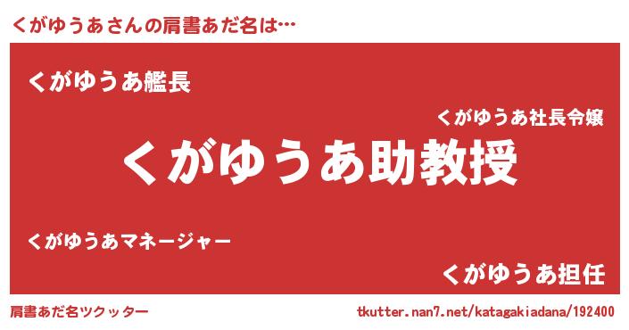 | ヒーロー風カッコイイあだ名 | 『慈愛の使者くがゆうあ』『炎刃騎士クガ』 |