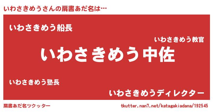 | 男性向けラノベタイトル風あだ名 | 『いわさきめう~年齢イコール彼女いない歴の魔法使い~』 |