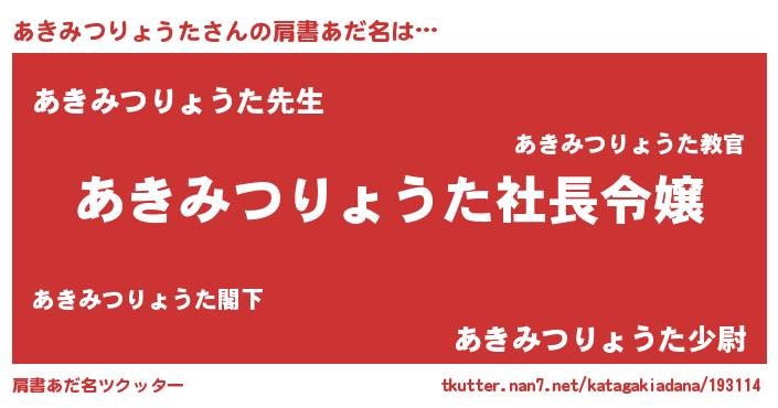| 男性向けラノベタイトル風あだ名 | 『アキミツリョウタアートオンライン』 |