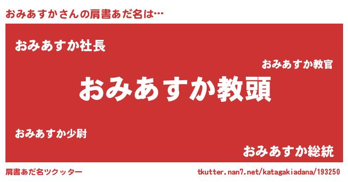 | 意味不明あだ名 | 『永久保存おみあすか』『自称おみあすか』 |
