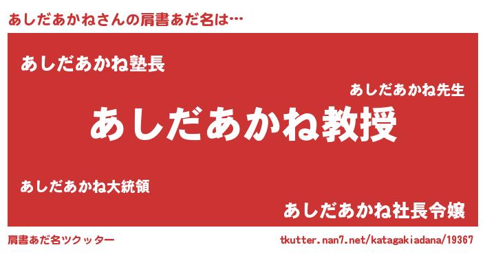| 男性向けラノベタイトル風あだ名 | 『ノーゲーム・ノーアシダアカネ』 |