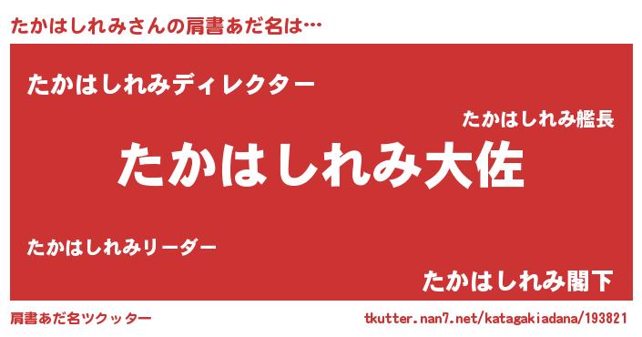 | ヒーロー風カッコイイあだ名 | 『究極戦士タカハシレミ』『魔戒騎士タカ』 |