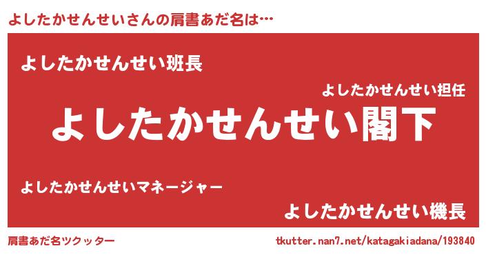 | 男性向けラノベタイトル風あだ名 | 『Re:よしたかせんせいから始める異世界生活』 |