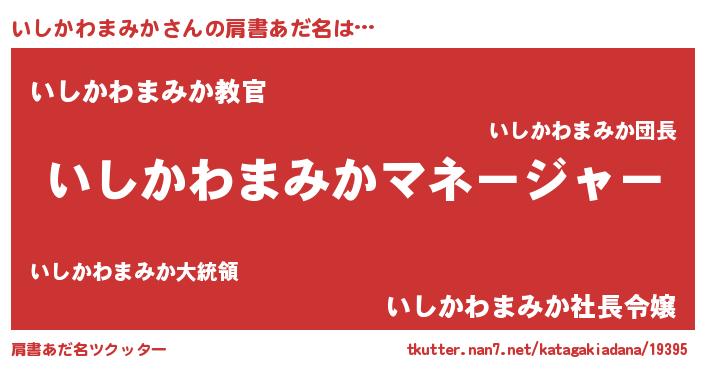 | 男性向けラノベタイトル風あだ名 | 『はたらくいしかわまみかさま!』 |