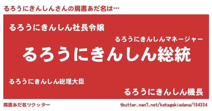 | 男性向けラノベタイトル風あだ名 | 『Re:るろうにきんしんから始める異世界生活』 |