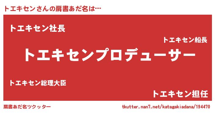 | 男性向けラノベタイトル風あだ名 | 『トエキセンに滅ぼされるだけの簡単なお仕事です』 |