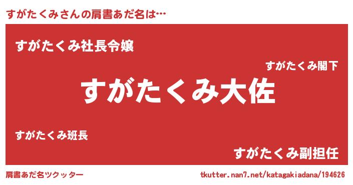 | 男性向けラノベタイトル風あだ名 | 『転生したらすがたくみだった件』 |