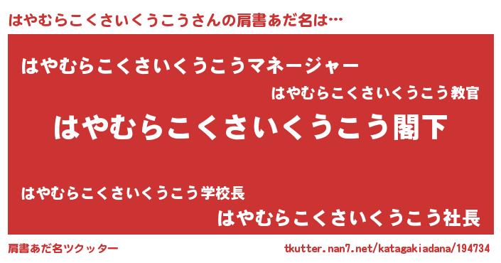 | 意味不明あだ名 | 『自称はやむらこくさいくうこう』 |