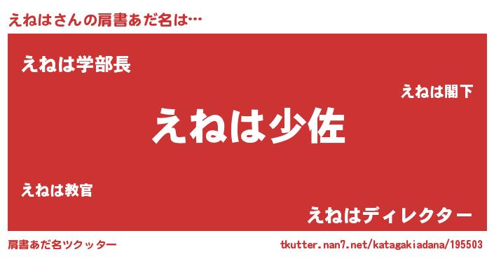 | 男性向けラノベタイトル風あだ名 | 『エネハスレイヤー』『魔弾の王とえねは』 |