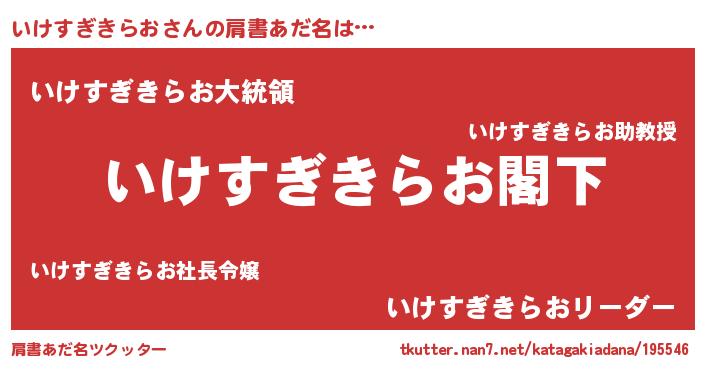 | 男性向けラノベタイトル風あだ名 | 『Re:いけすぎきらおから始める異世界生活』 |