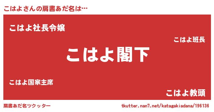 | 男性向けラノベタイトル風あだ名 | 『Re:こはよから始める異世界生活』 |