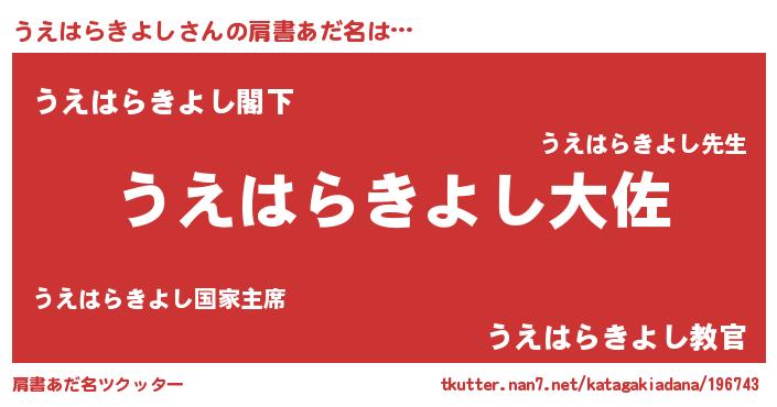 | 女子向けラノベタイトル風あだ名 | 『うえはらきよしの玉の輿計画!』 |