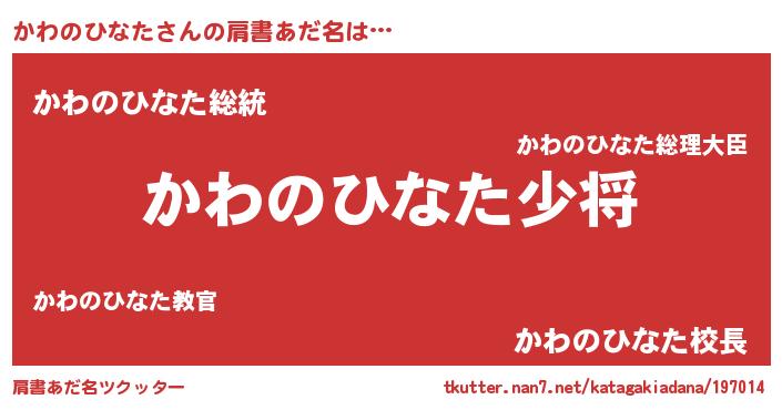 | 男性向けラノベタイトル風あだ名 | 『カワノヒナタスレイヤー』 |
