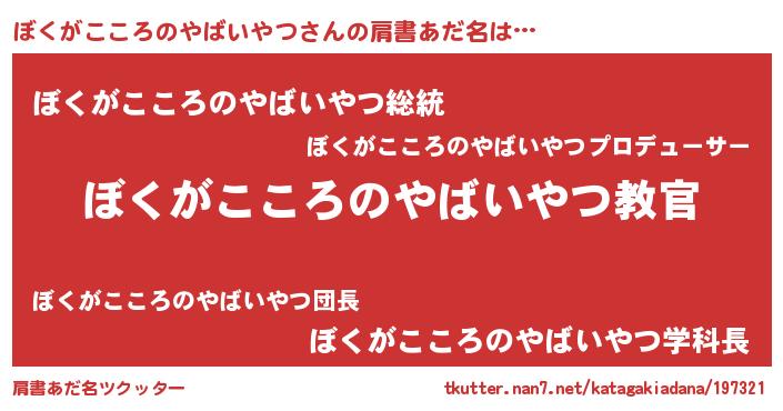 | 女子向けラノベタイトル風あだ名 | 『ぼくがこころのやばいやつが死なない童話 林檎のぼくがこころのやばいやつの診療簿』 |