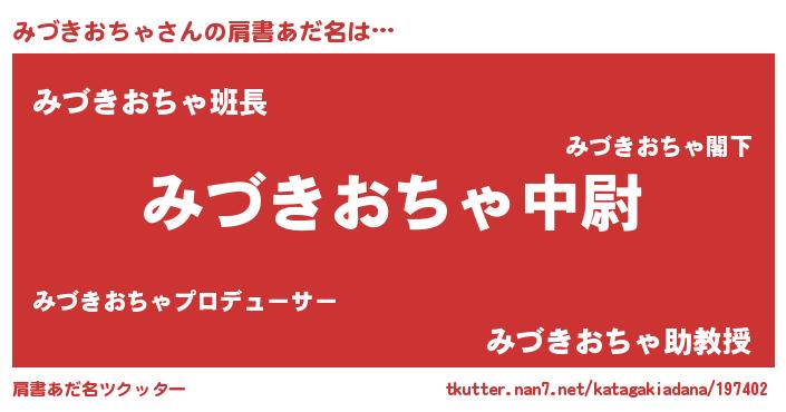 | 男性向けラノベタイトル風あだ名 | 『転生したらみづきおちゃだった件』 |