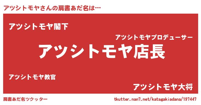 | 男性向けラノベタイトル風あだ名 | 『アツシトモヤアートオンライン』 |