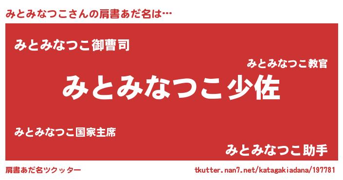 | 男性向けラノベタイトル風あだ名 | 『みとみなつこ~年齢イコール彼女いない歴の魔法使い~』 |
