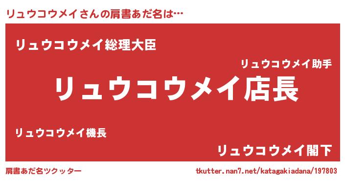 | 男性向けラノベタイトル風あだ名 | 『リュウコウメイアートオンライン』 |