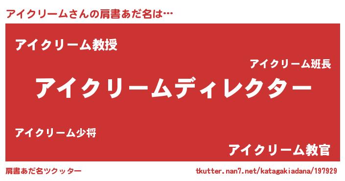 | 男性向けラノベタイトル風あだ名 | 『アイクリームに滅ぼされるだけの簡単なお仕事です』 |