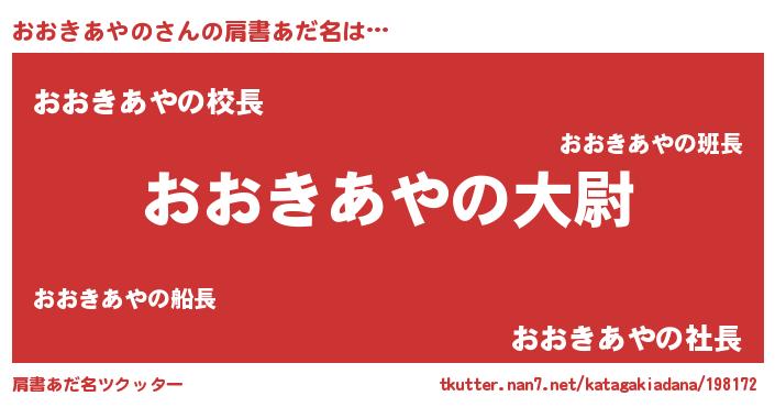 | 男性向けラノベタイトル風あだ名 | 『おおきあやの~年齢イコール彼女いない歴の魔法使い~』 |