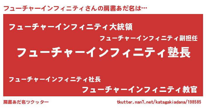| 男性向けラノベタイトル風あだ名 | 『ダンジョンにフューチャーインフィニティを求めるのは間違っているだろうか』 |