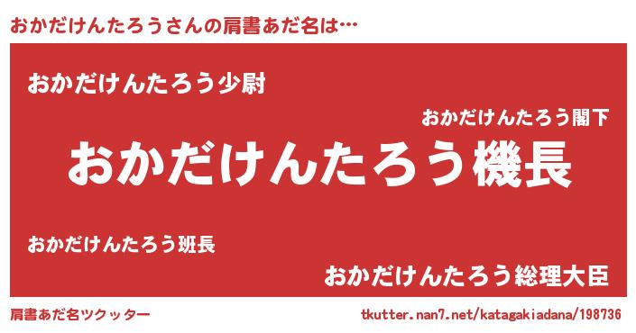 | 男性向けラノベタイトル風あだ名 | 『うちのおかだけんたろうが世界を掌握している!』 |