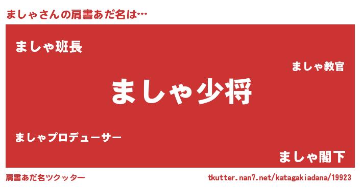 | 男性向けラノベタイトル風あだ名 | 『ましゃ~年齢イコール彼女いない歴の魔法使い~』 |