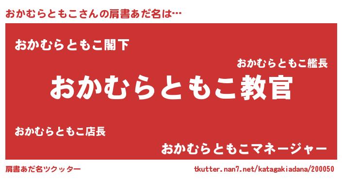 | 男性向けラノベタイトル風あだ名 | 『魔弾の王とおかむらともこ』 |