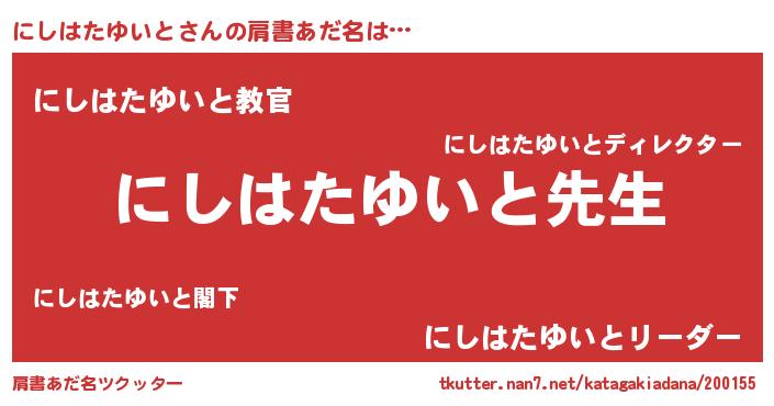 | ヒーロー風カッコイイあだ名 | 『ネオニシハタユイト』『仮面ニシダー』 |