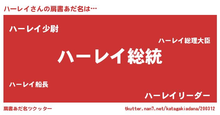 | ヒーロー風カッコイイあだ名 | 『最強戦士ハーレイ』『魔戒騎士ハー』 |