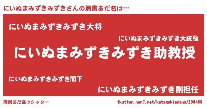 | 男性向けラノベタイトル風あだ名 | 『おまえをオタクにしてやるから、俺をにいぬまみずきみずきにしてくれ! 』 |