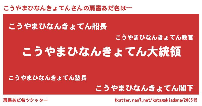 | 欧米人風あだ名 | 『こうやまひなんきょてんクリステル』 |