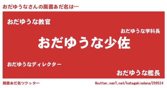| 男性向けラノベタイトル風あだ名 | 『おだゆうな~年齢イコール彼女いない歴の魔法使い~』 |