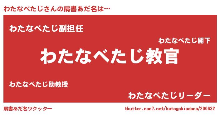 | 女子向けラノベタイトル風あだ名 | 『乙女ゲームの破滅フラグしかない悪役わたなべたじに転生してしまった…』 |