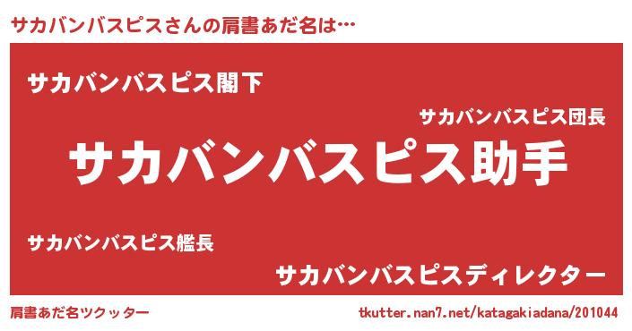 | 男性向けラノベタイトル風あだ名 | 『ノーゲーム・ノーサカバンバスピス』 |
