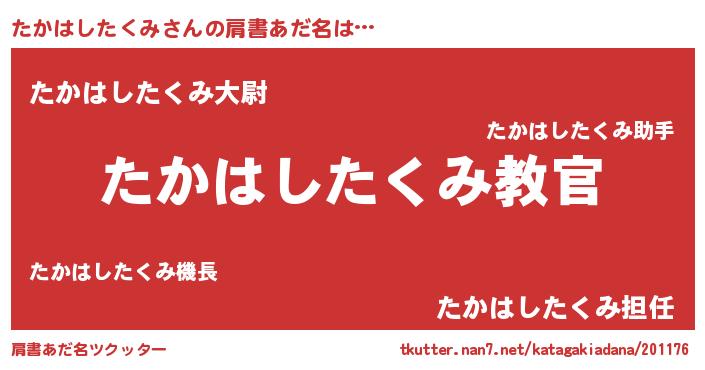 | 男性向けラノベタイトル風あだ名 | 『この素晴らしい世界にたかはしたくみを!』 |