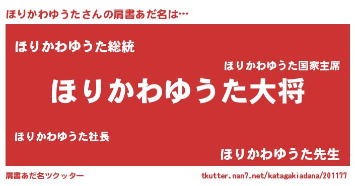 | 男性向けラノベタイトル風あだ名 | 『ほりかわゆうた~年齢イコール彼女いない歴の魔法使い~』 |