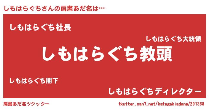| 男性向けラノベタイトル風あだ名 | 『しもはらぐちという概念が存在しない退屈な世界 』 |