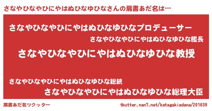 | 男性向けラノベタイトル風あだ名 | 『おまえをオタクにしてやるから、俺をさなやひなやひにやはぬひなゆひなにしてくれ! 』 |