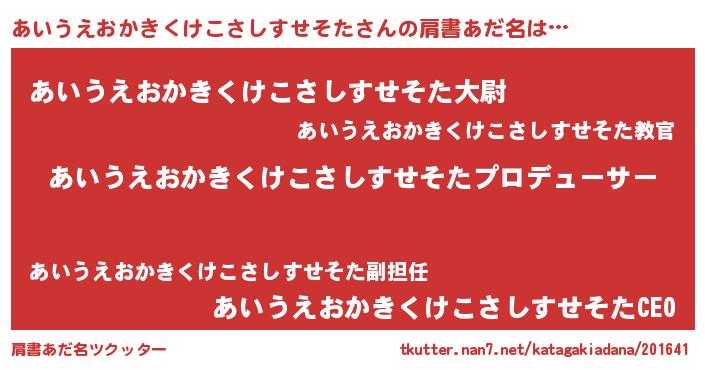 | 男性向けラノベタイトル風あだ名 | 『はたらくあいうえおかきくけこさしすせそたさま!』 |