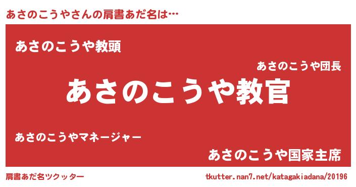 | 女子向けラノベタイトル風あだ名 | 『あさのこうやが死なない童話 林檎のあさのこうやの診療簿』 |
