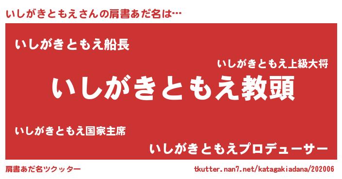 | ヘコむあだ名 | 『いしがきともえ(笑)』『なまこ酢』 |